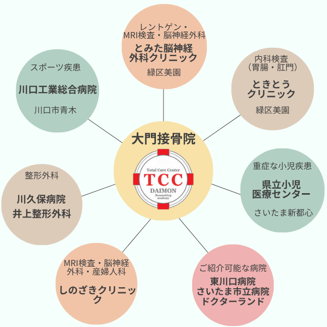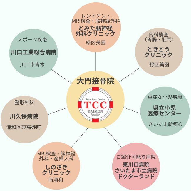 埼玉県内の整形外科医や内科医等の医療機関との連携を取り、あらゆる角度から最適な治療を行います。